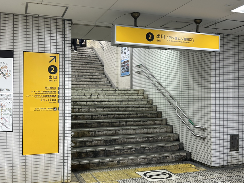 ①四ツ橋駅の改札を出たら、2番出口を目指して進みます。
