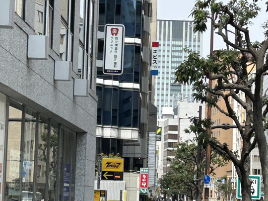 ③タイムスやなか卯が見えます。その先にトリコロールカラーのエビスという看板の建物がRENTARO四ツ橋grandeが入っている戎四ツ橋ビルです。エレベーターで5階までお上がり下さい。